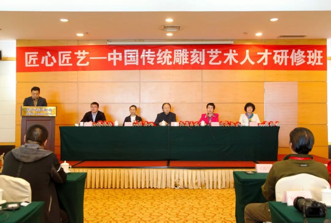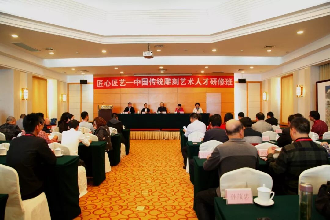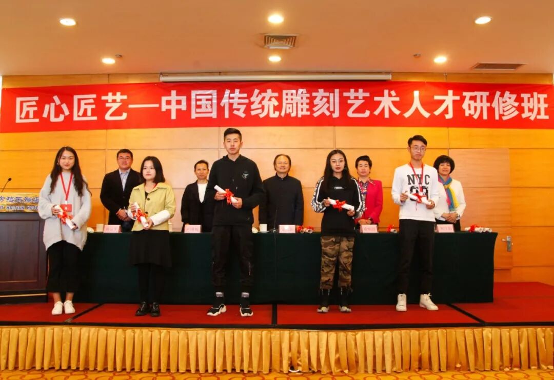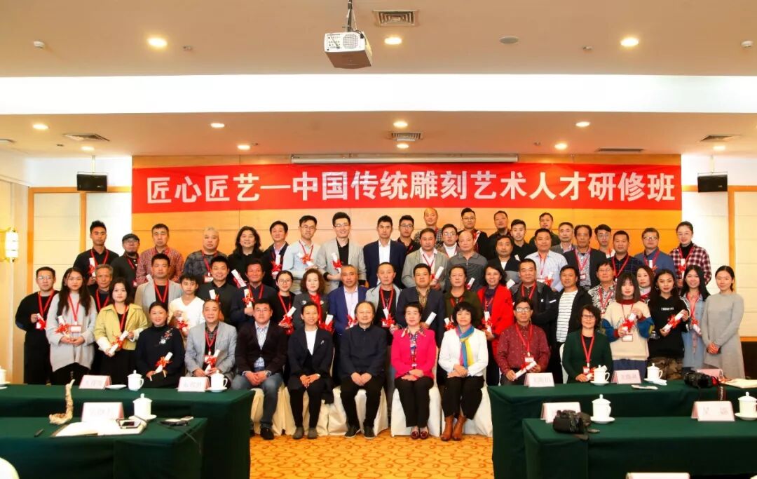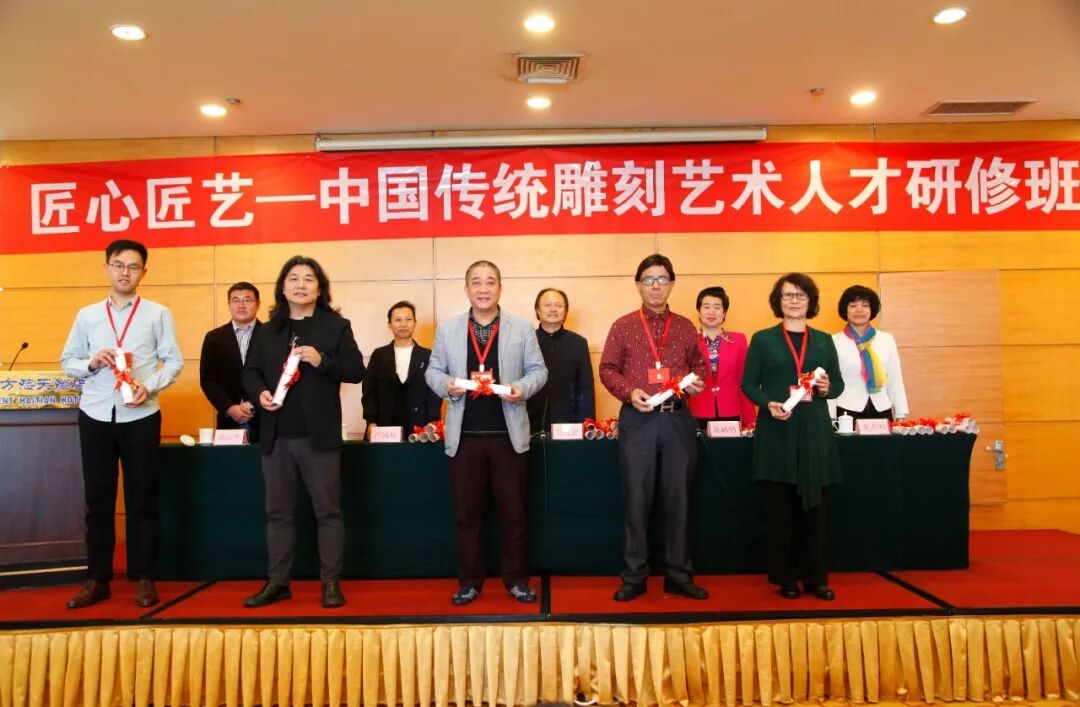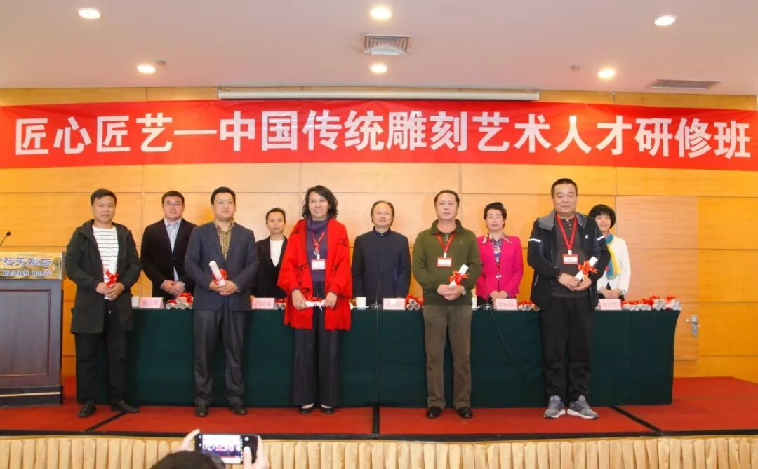 经过一周理论与实践的研修,10月20日,“匠心匠艺---中国传统雕刻艺术人才研修班”圆满结业。中国民协副主席吴元新、中国文联民间文艺艺术中心主任徐岫鹃、中国文联民间文艺艺术中心教育培训处主任朱芹勤、中国建筑与园林艺术委员会秘书长曲云华、烟台市文联主席卢国栋及来自全国各省市自治区70余位木雕、砖雕、石雕、根雕、核雕、篆刻、园艺领域的企业家代表和优秀匠师参加了结业仪式。